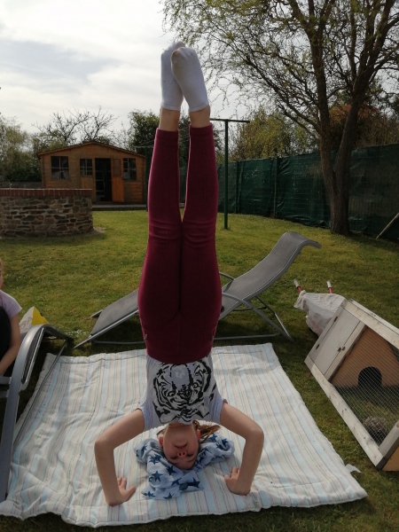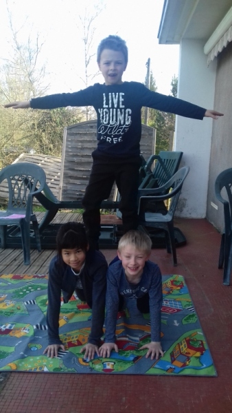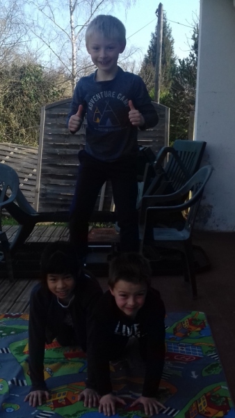 Malgré le confinement, les élèves de CE2-CM1-CM2 travaillent à distance. Ils continuent les séances d’acrogym à la maison. La consigne était la suivante: trouver le plus possible de positions avec un pied et une main au sol, un genou et une main au sol, le dos et un pied au sol, deux mains et un pied au sol.
