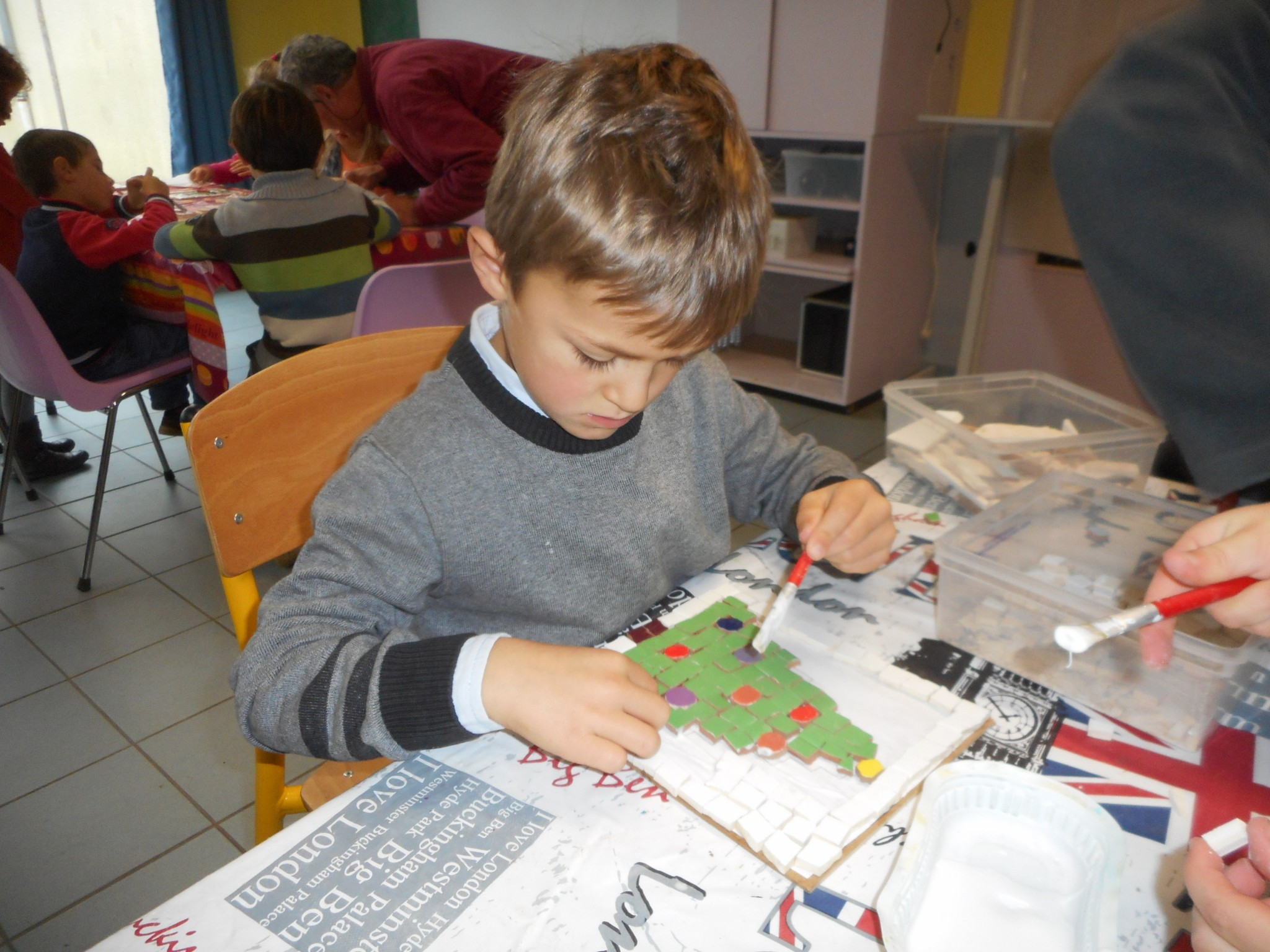 Quelques semaines avant Noël, les enfants de GS-CP ont réalisé des sapins en mosaïque avec l’aide des travailleurs de la SACAT de Carquefou.