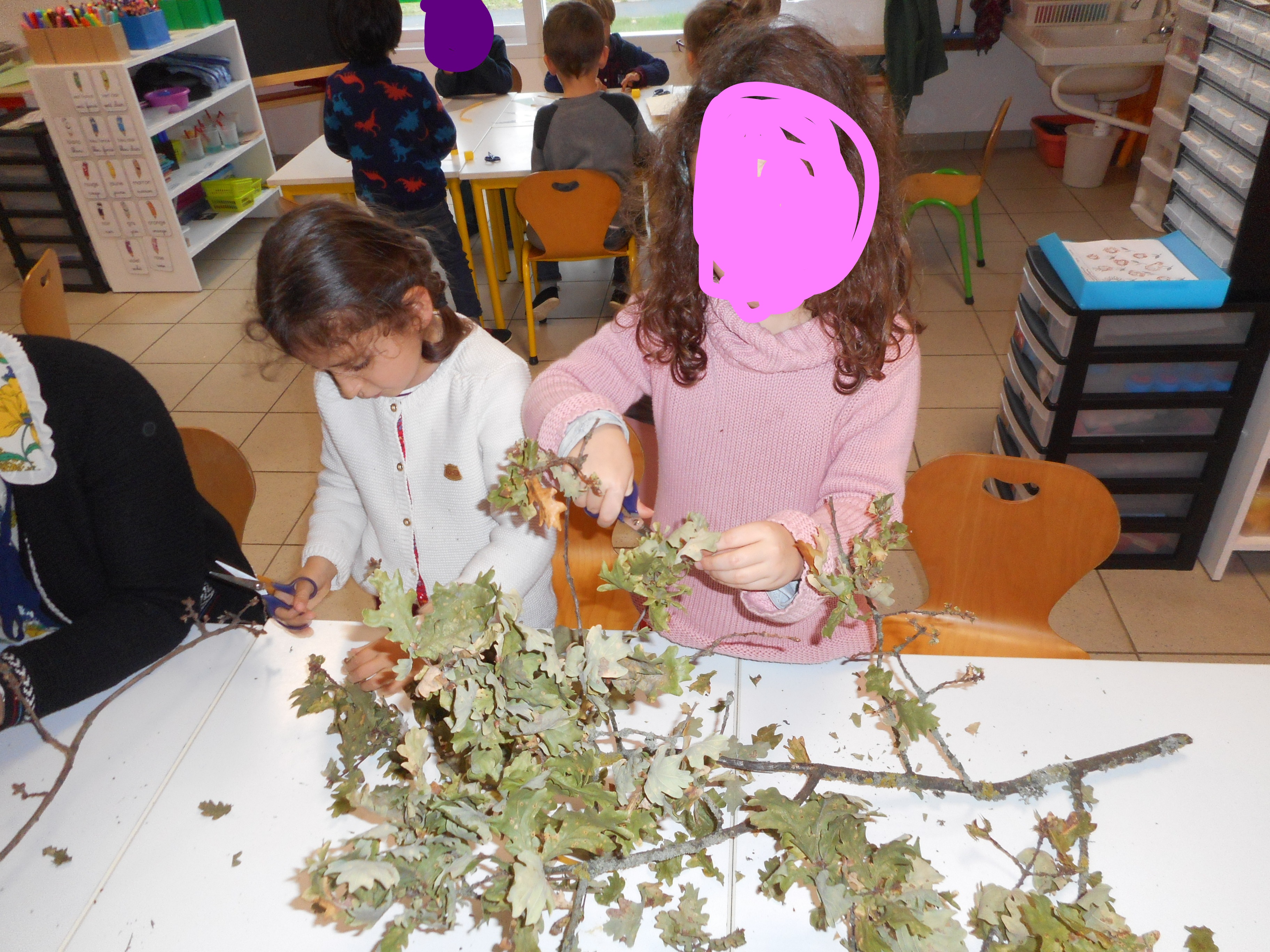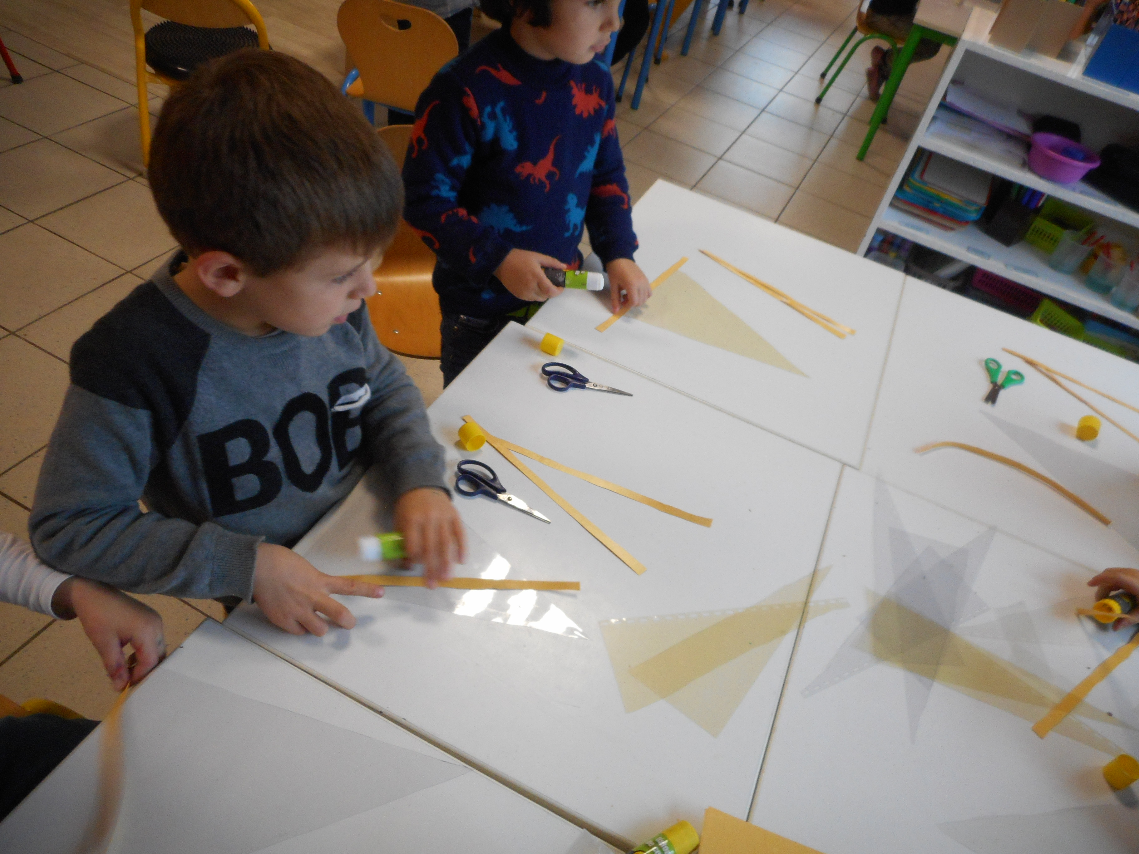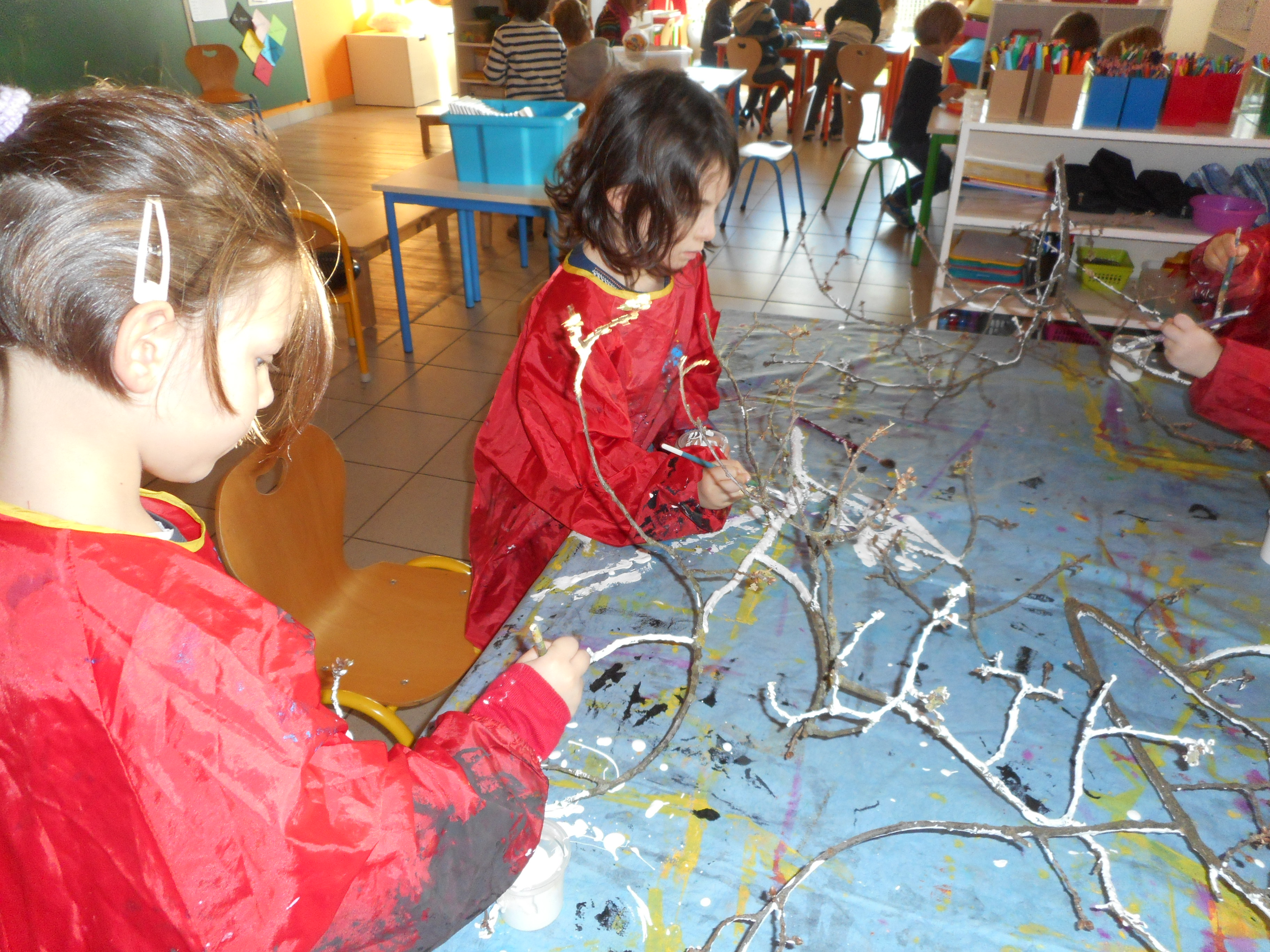 Les artistes sont en plein travail pour embellir le couloir de la maternelle et leur classe.