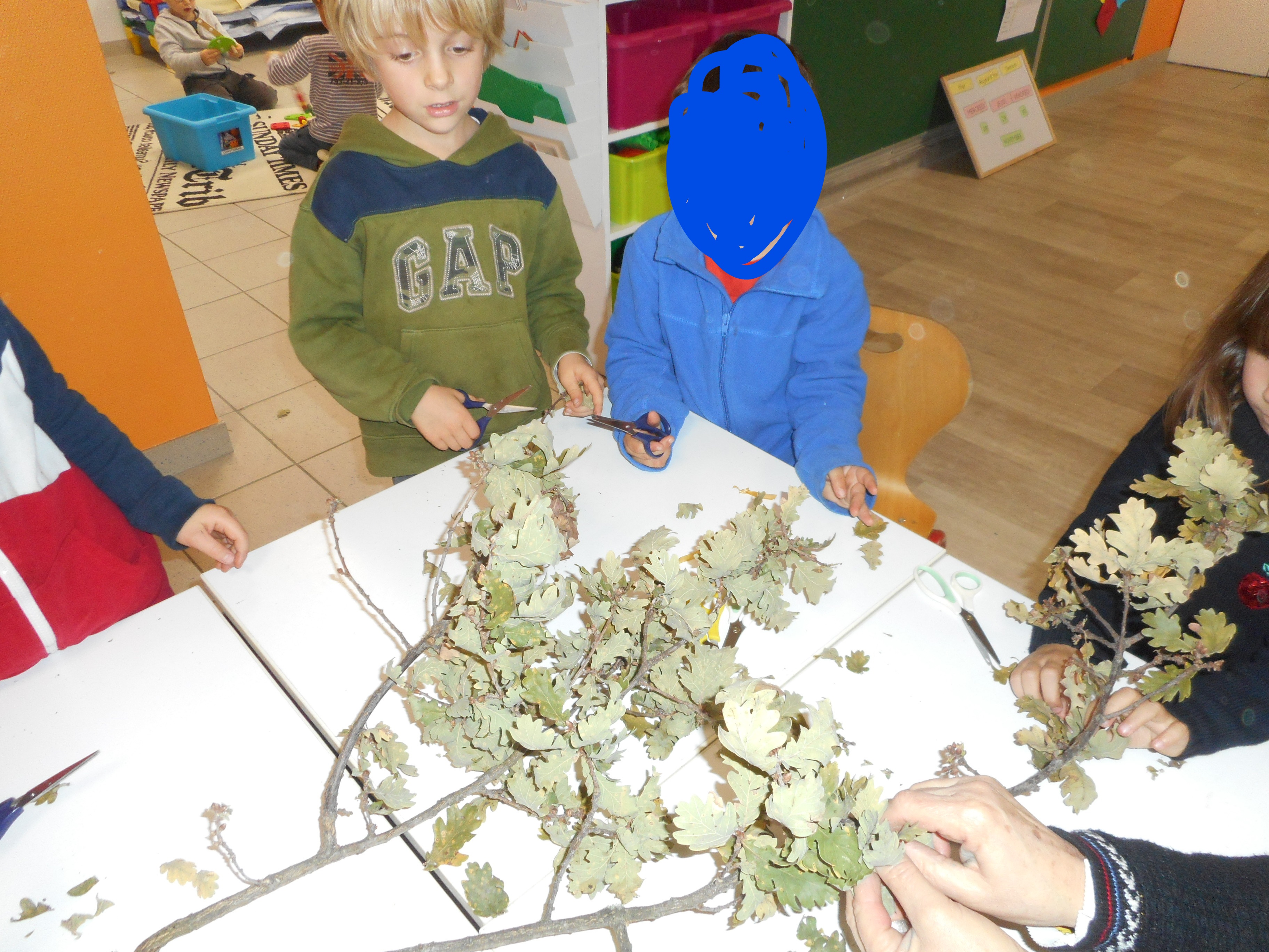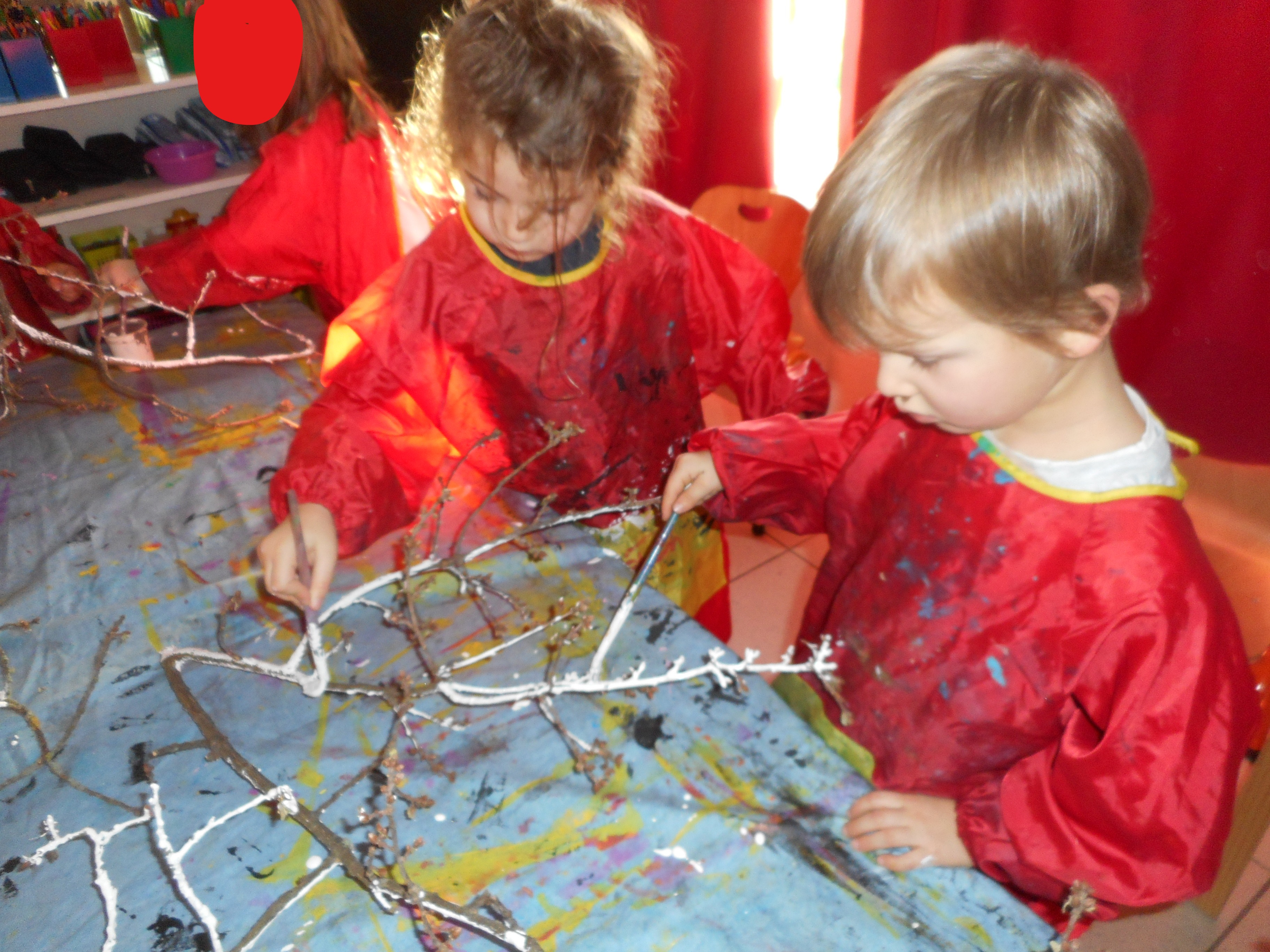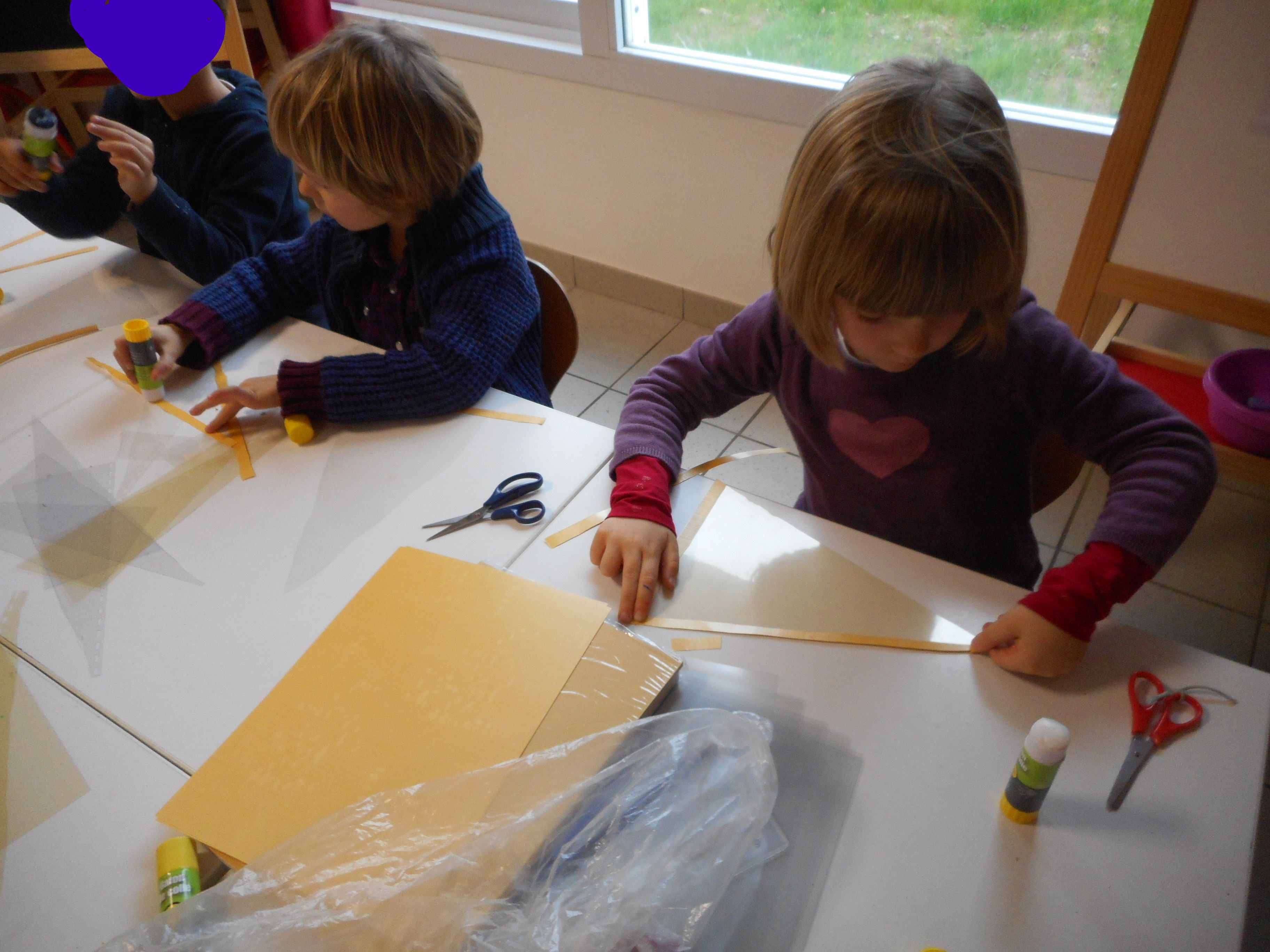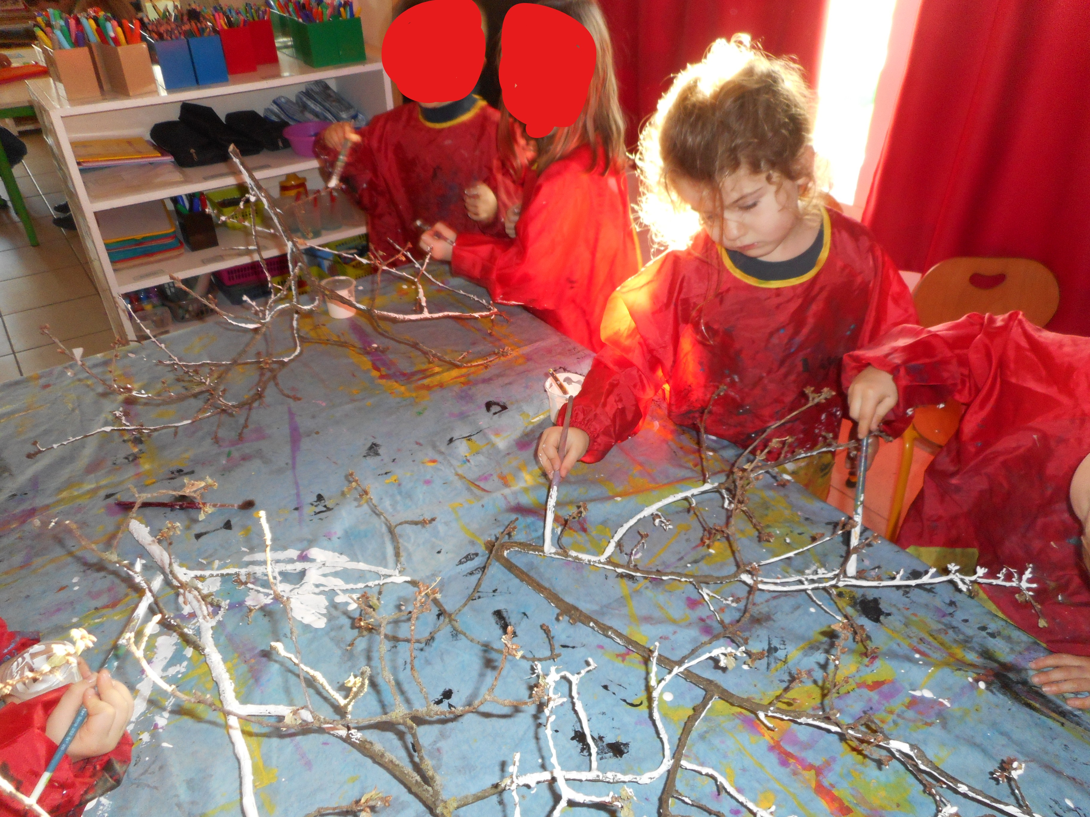 Les artistes sont en plein travail pour embellir le couloir de la maternelle et leur classe.