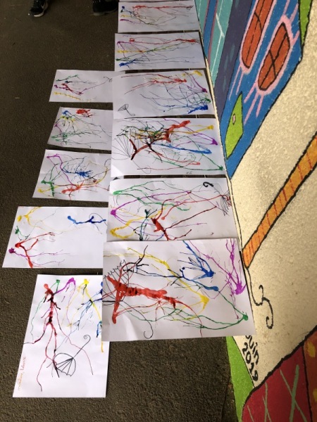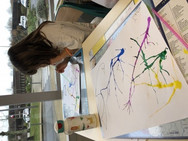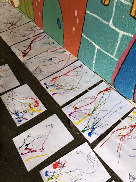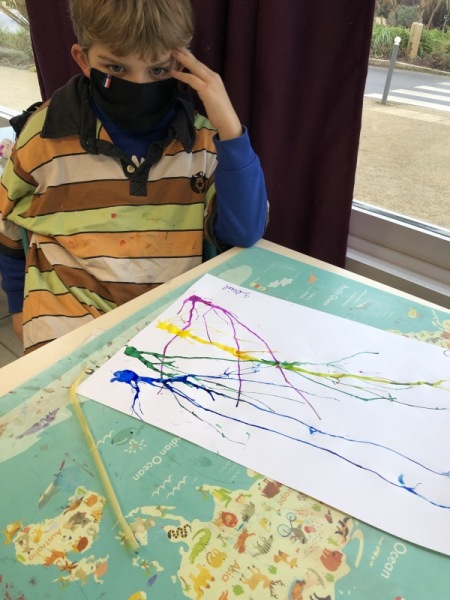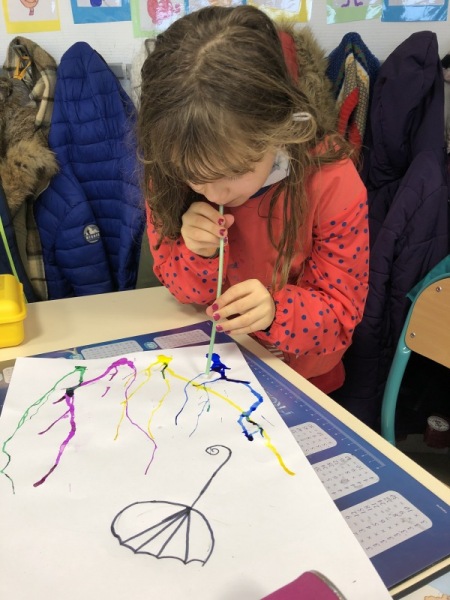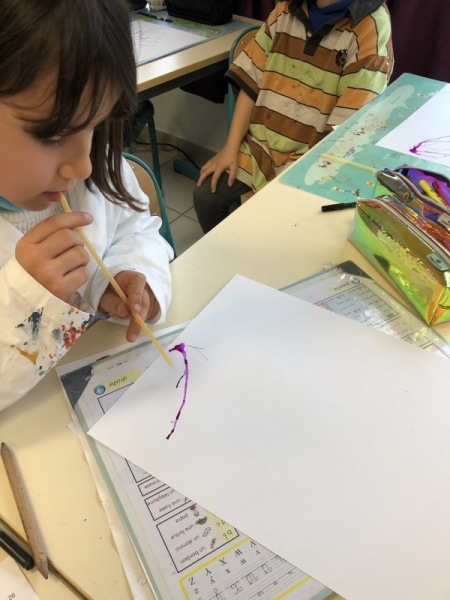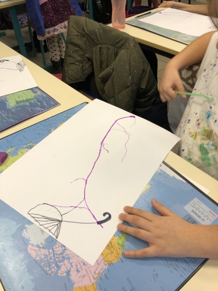 Nos parapluies se sont retournés avec la force du vent. Mais d’où vient-il ? Vers où il souffle ? Les enfants ont imité la direction du vent en soufflant dans une paille pour faire progresser une tâche d’encre le long de leur feuille.