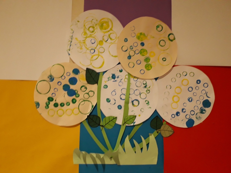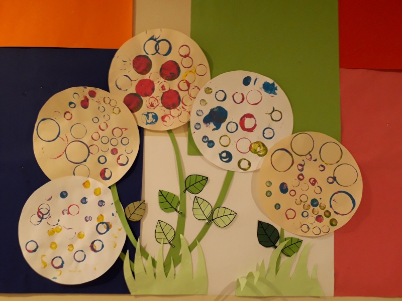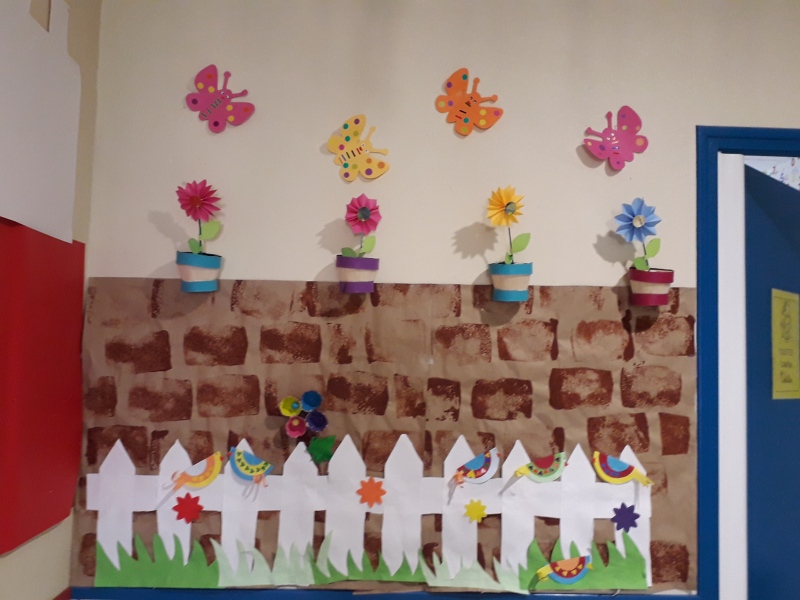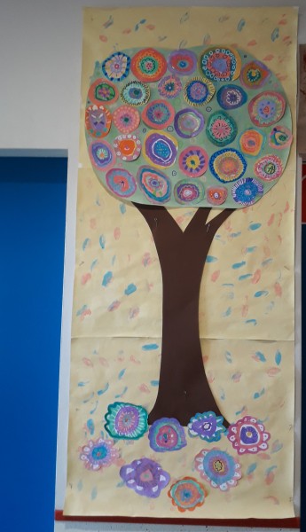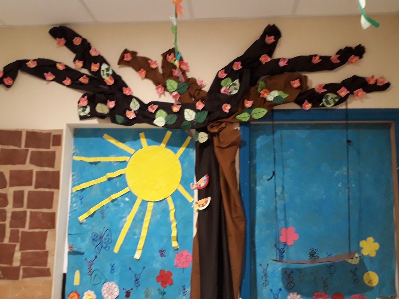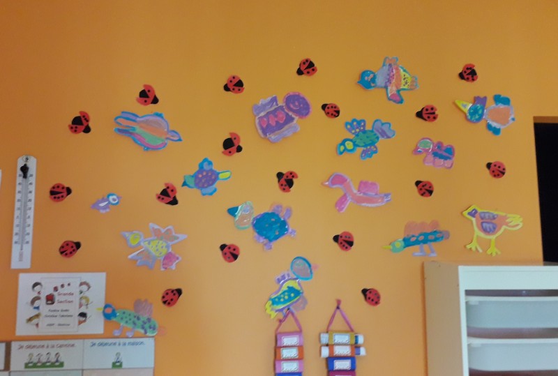 Au retour des vacances de février, les enfants de maternelle ont fait de ateliers communs pour décorer leur couloir (voir article “la maternelle fait le printemps).