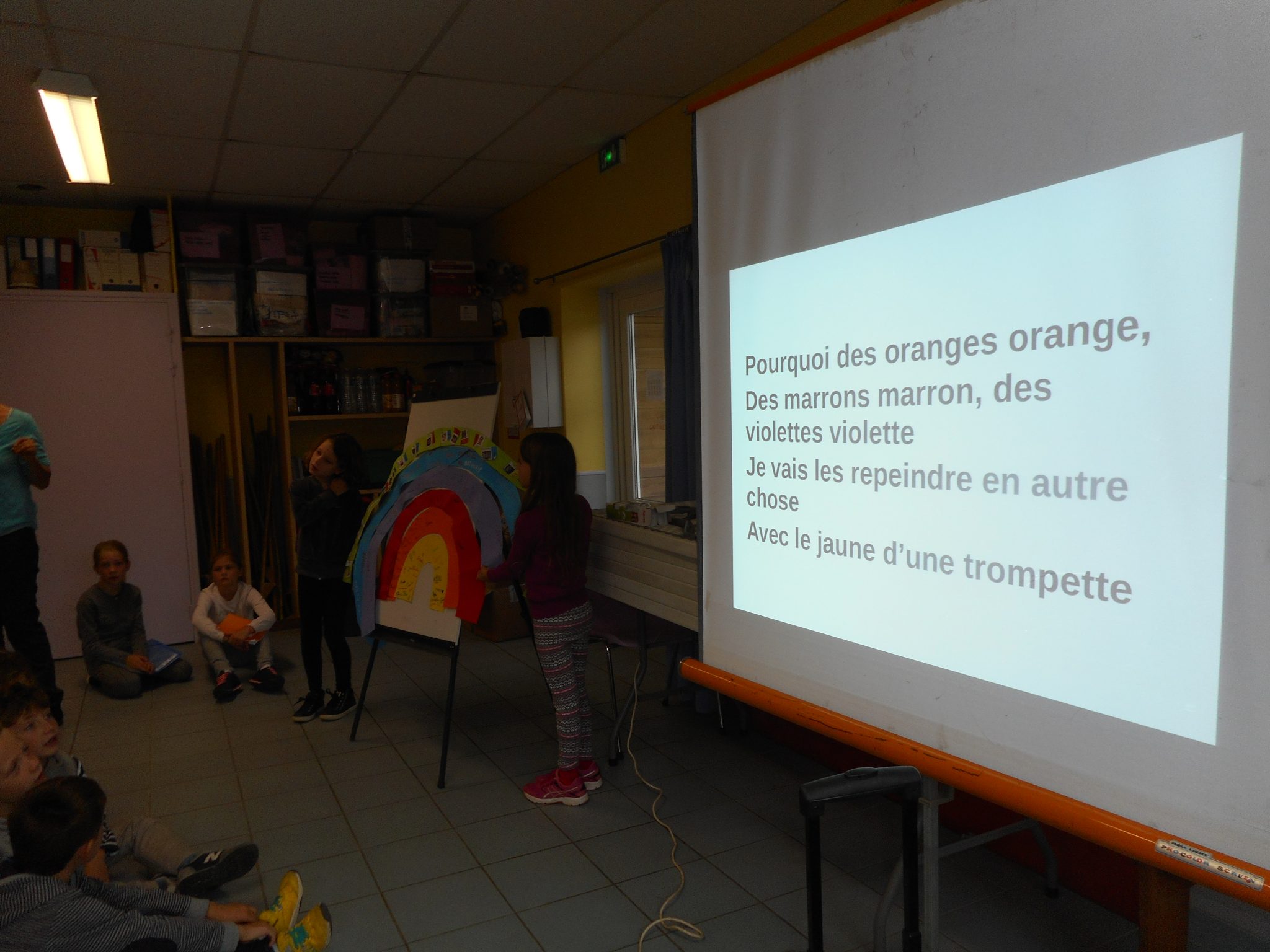 Chaque classe a apporté un morceau de l’arc-en-ciel qui a été accroché sur le mur de la salle polyvalente.