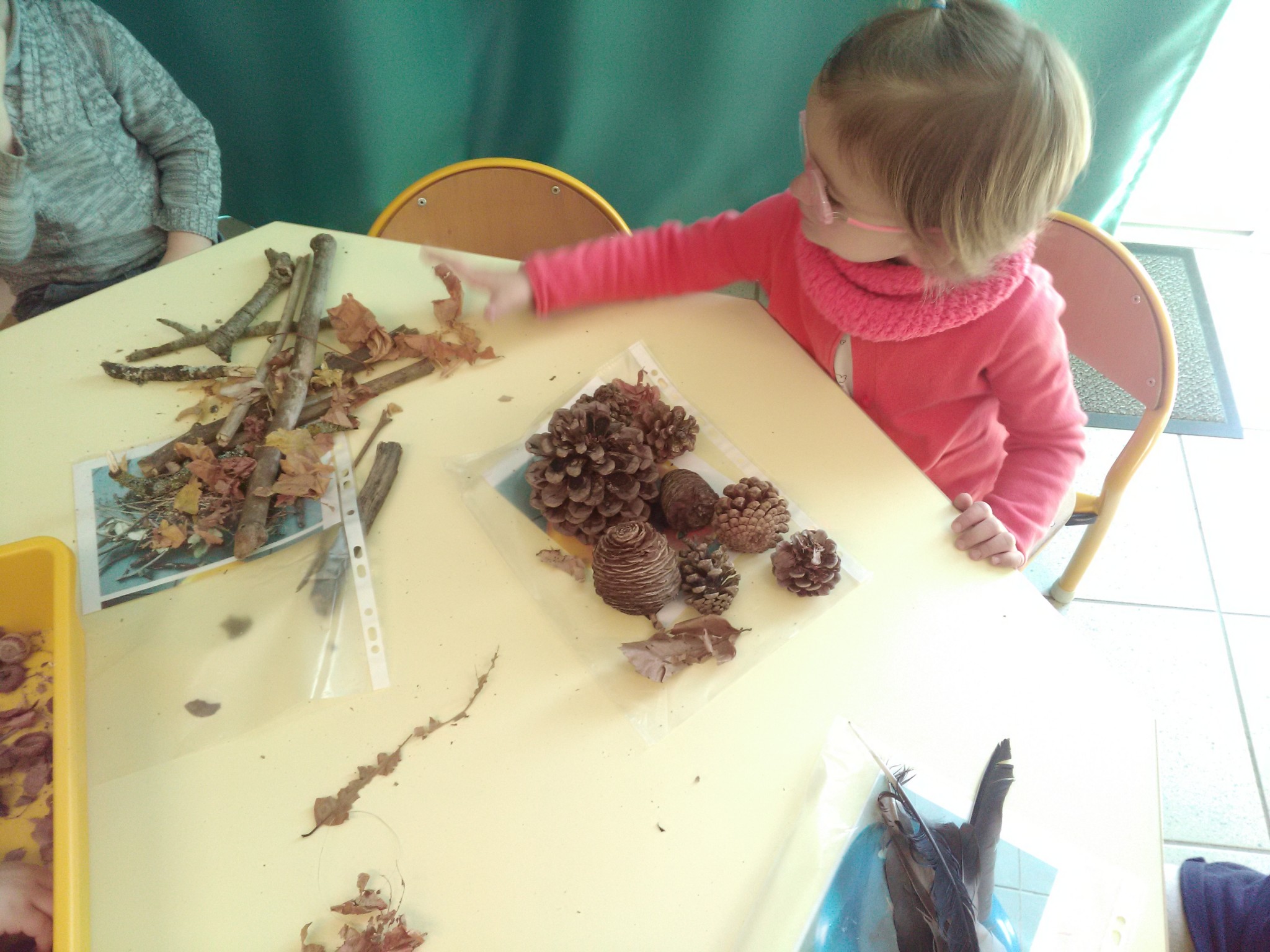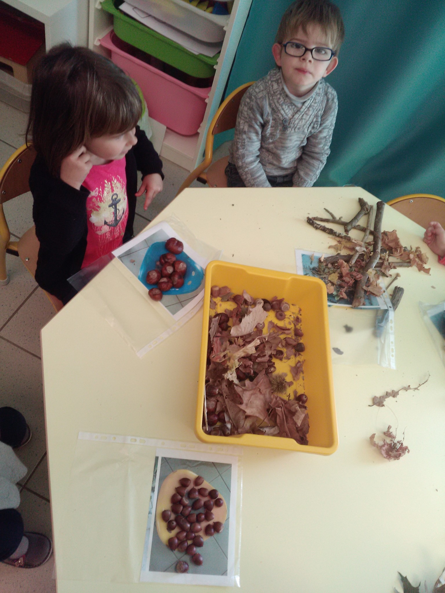 Le point de départ des ateliers de ces dernières semaines a été notre promenade au parc de la Vignette. En effet, les trésors d’automne ramassés lors de cette balade ont fait émerger un besoin de manipuler ses trouvailles…Tri, réalisation d’un livret d’empreintes…
