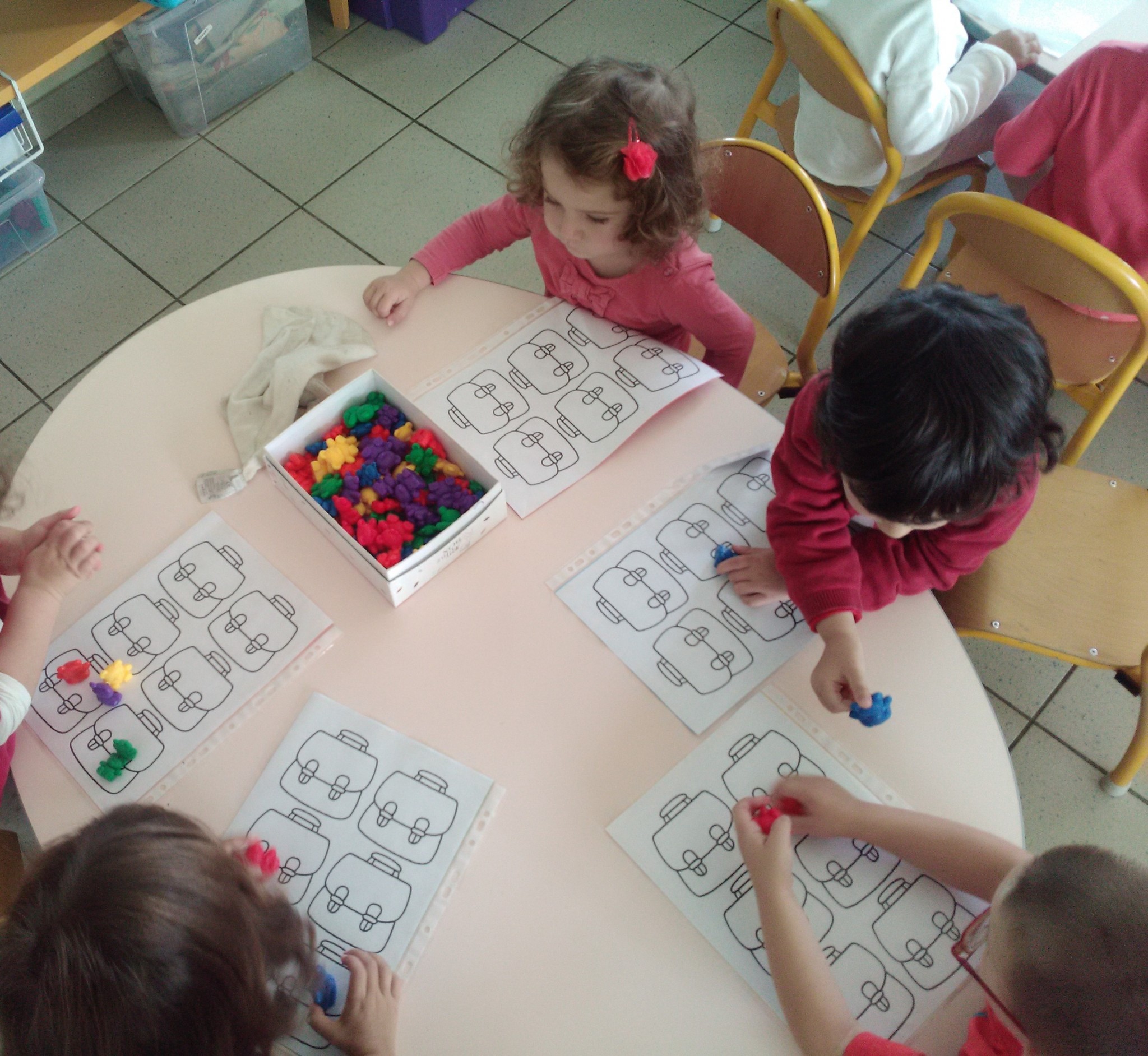 -apprendre la quantité 1 : distribuer un doudou dans chaque cartable