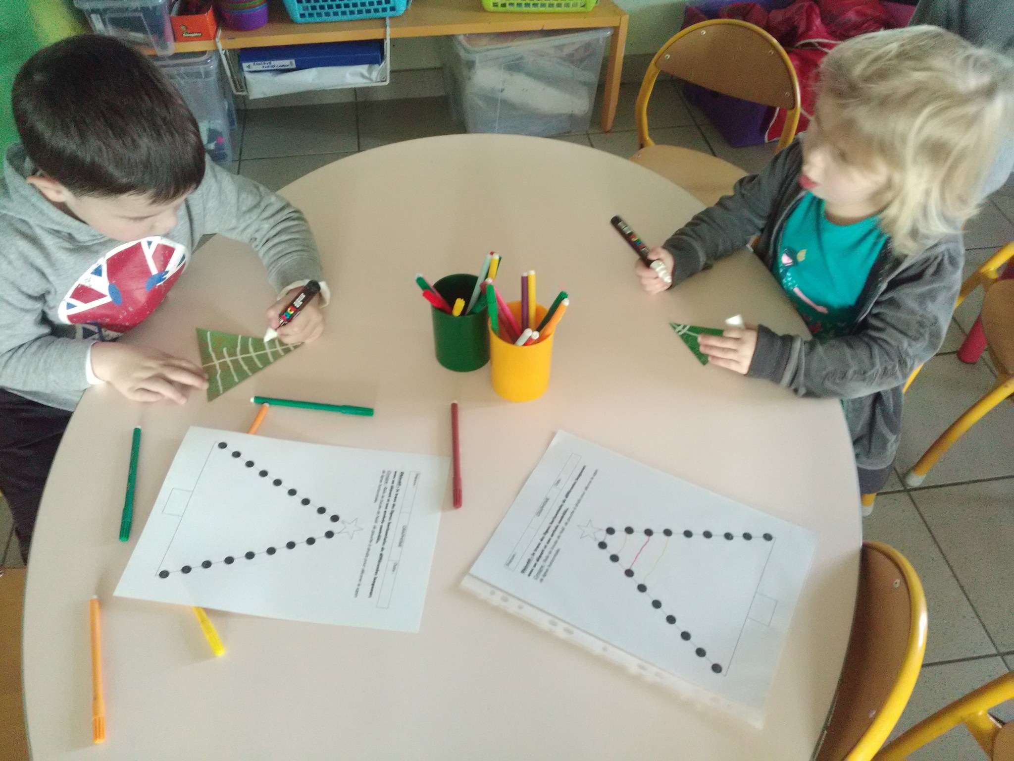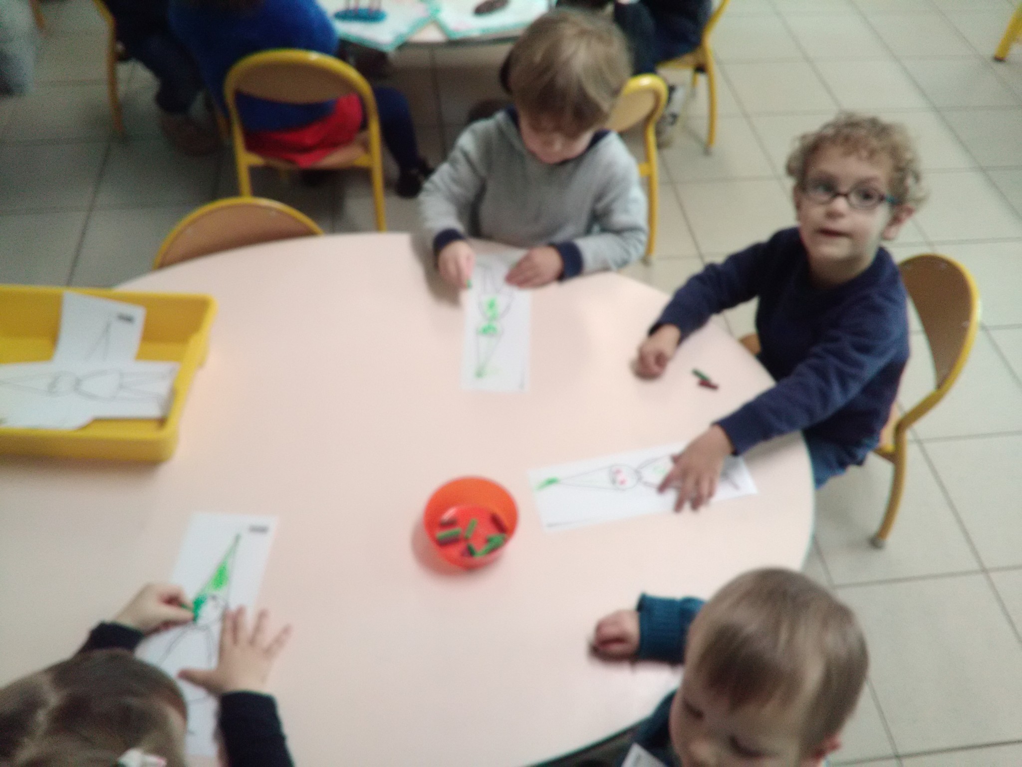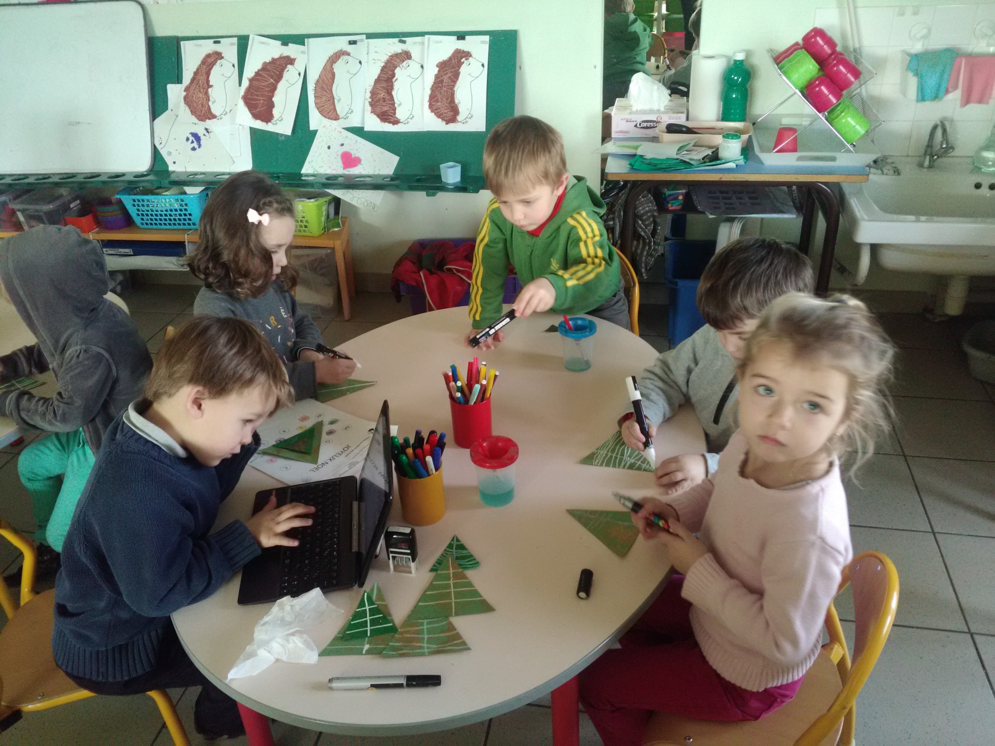 -réaliser une carte de Noël : faire des empreintes de doigts pour représenter les branches du sapin (voir cahier de vie)