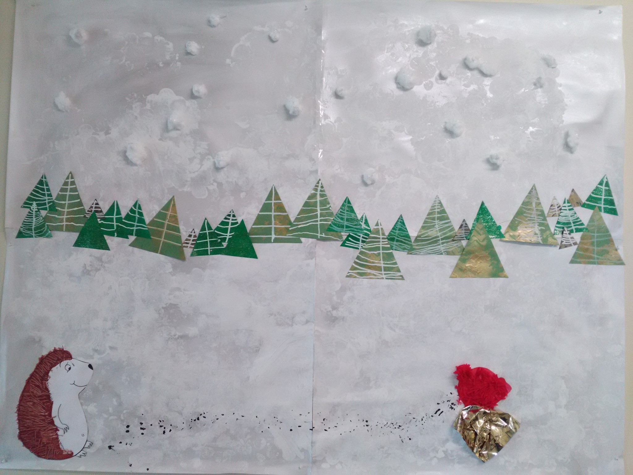 -réalisation du paysage hivernal du hérisson : peinture, graphisme et collage