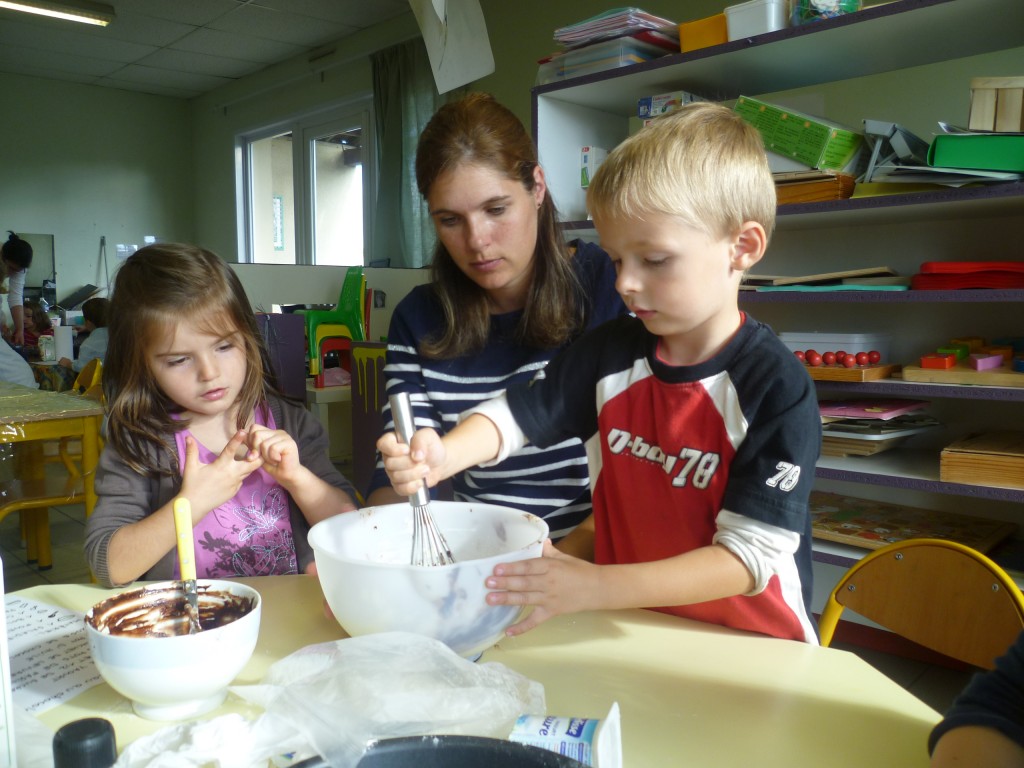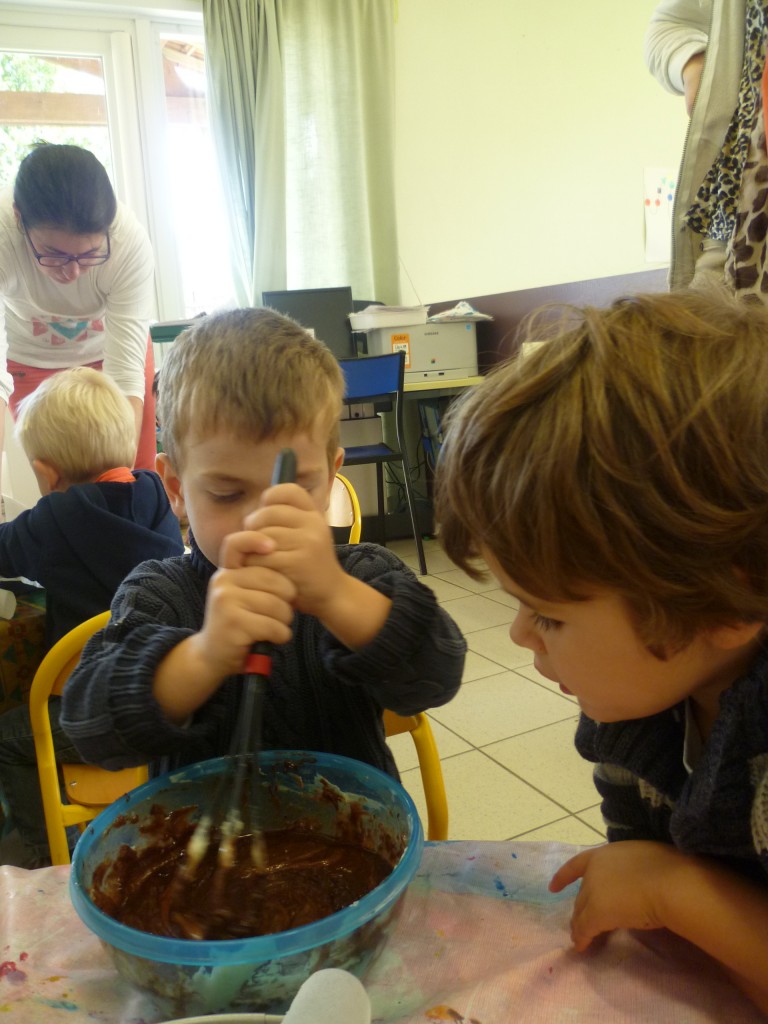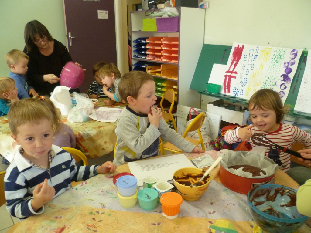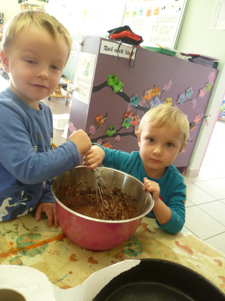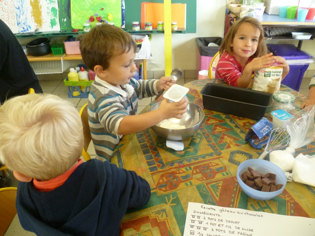 A l’occasion de la semaine du goût, la classe de TPS.PS.MS a cuisiné un gâteau au chocolat sans oeufs!
