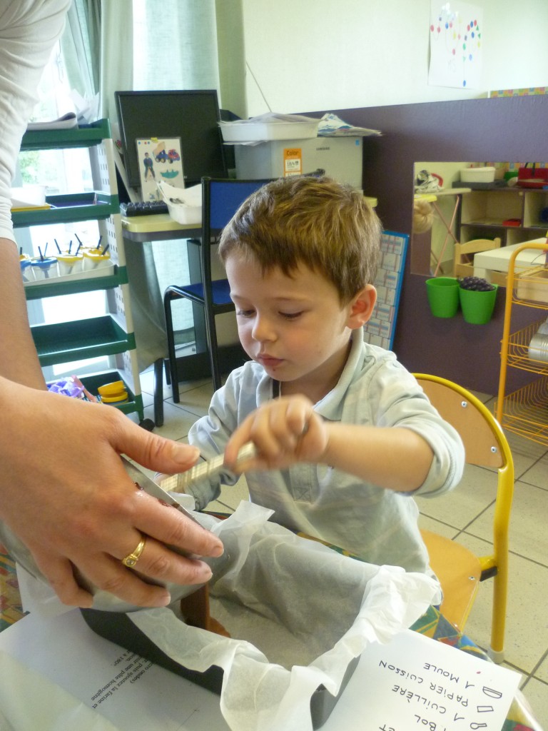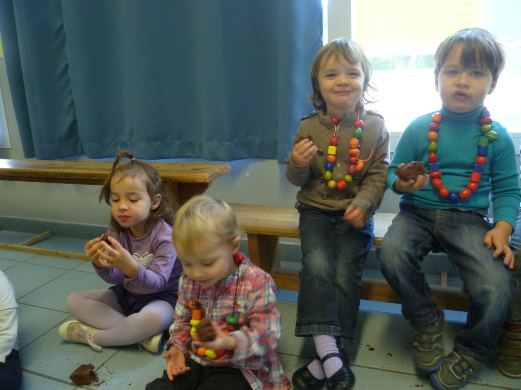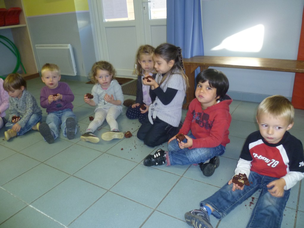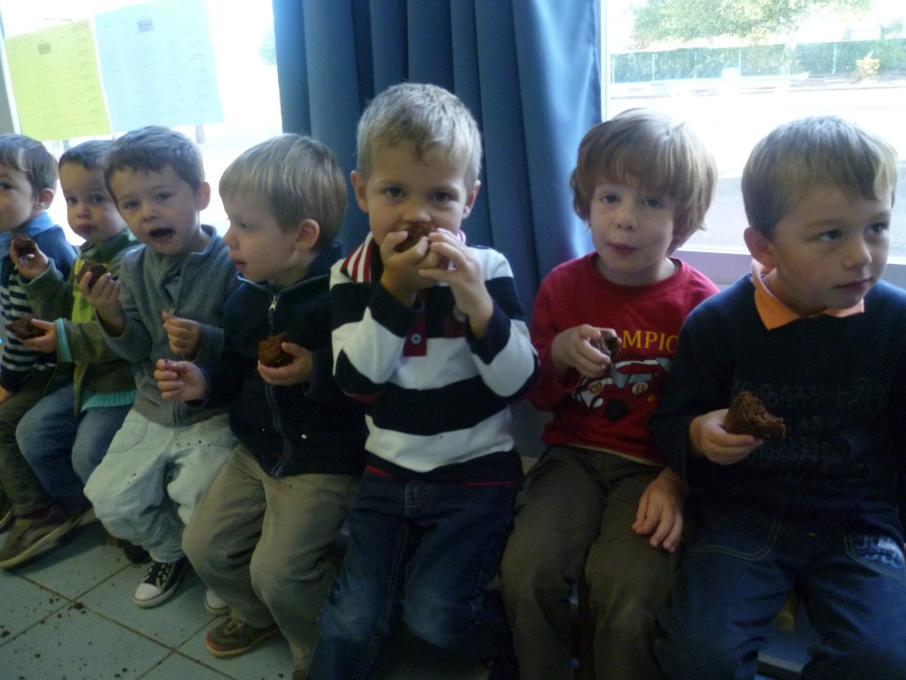 Finalement, cette expérience s’est achevé le lendemain où nous avons partagé le goûter avec la classe de MS.GS qui, de son côté, avait confectionné un gâteau aux carottes et raisins secs!
