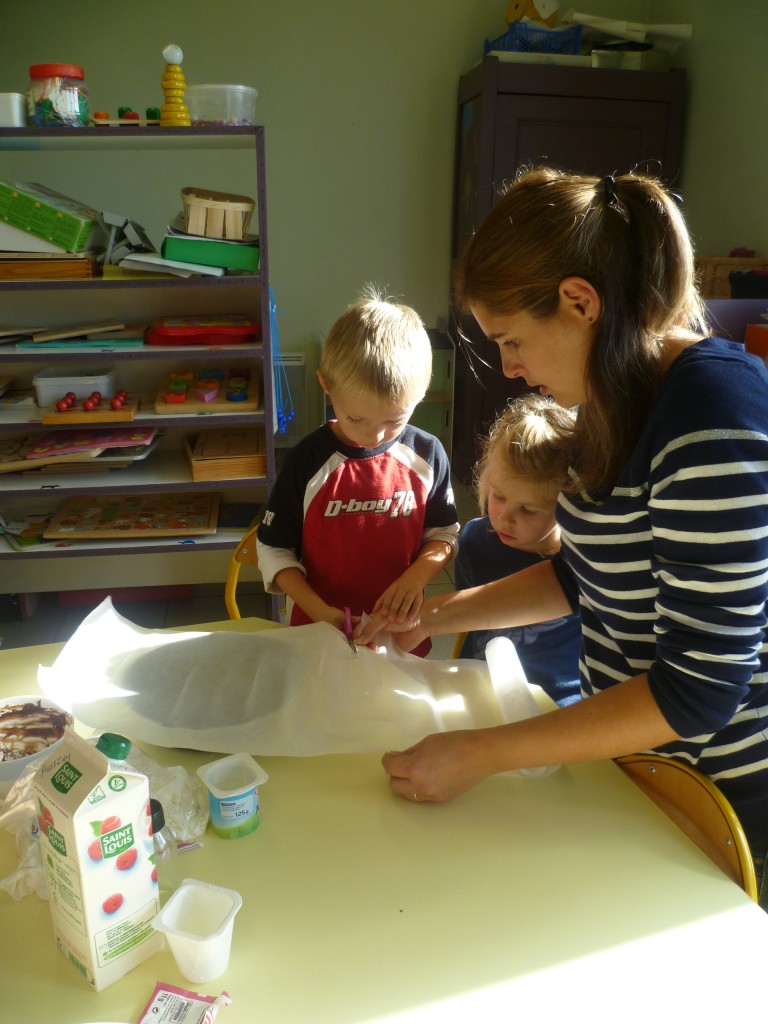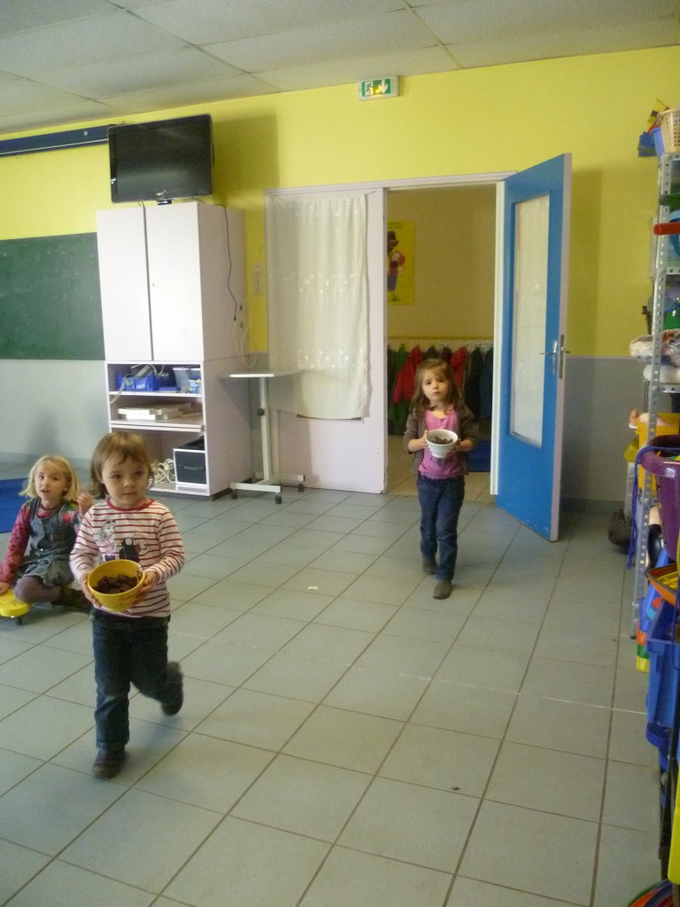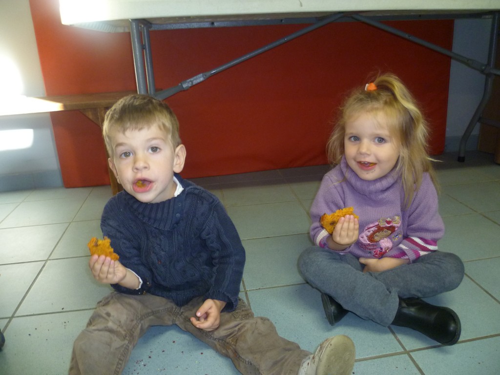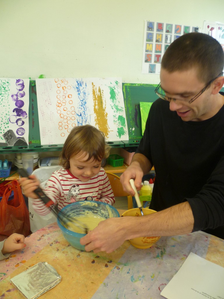 Finalement, cette expérience s’est achevé le lendemain où nous avons partagé le goûter avec la classe de MS.GS qui, de son côté, avait confectionné un gâteau aux carottes et raisins secs!