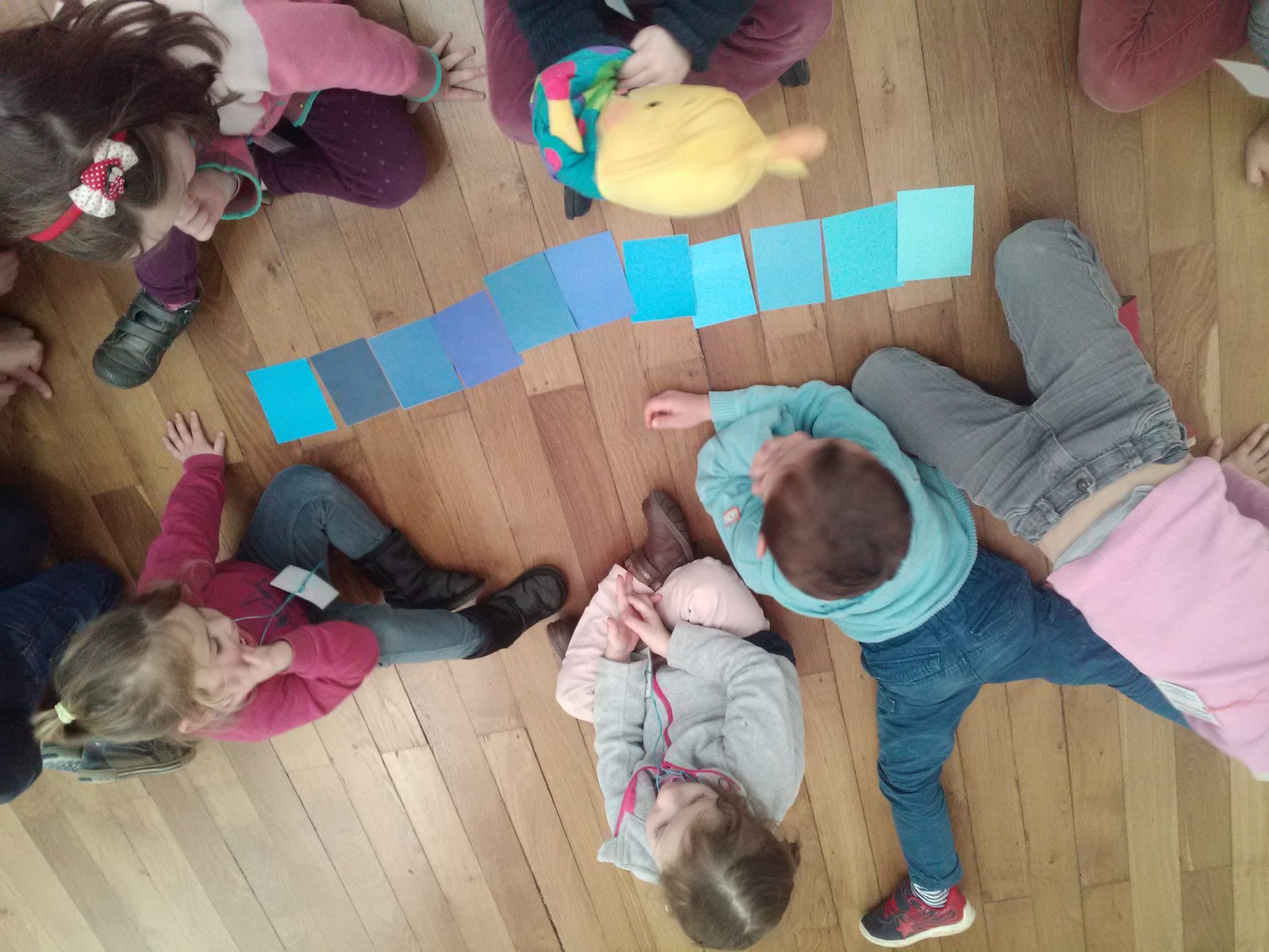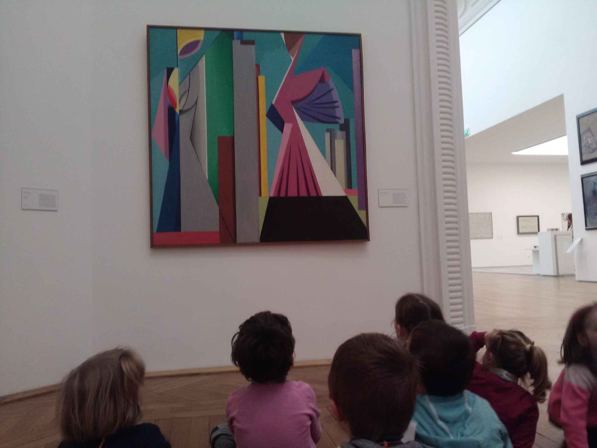 “Deux femmes debout” d’Alberto MAGNELLI: la couleur dominante était le bleu. L’imagination des enfants a été débordante devant cette peinture contemporaine. Certains y ont vu un perroquet, un rhinocéros et d’autres, bel et bien, deux silhouettes. La mallette nous a proposé une activité sur la notion de nuances de couleur. Les élèves ont dû classer des cartons bleus du plus clair au plus foncé.