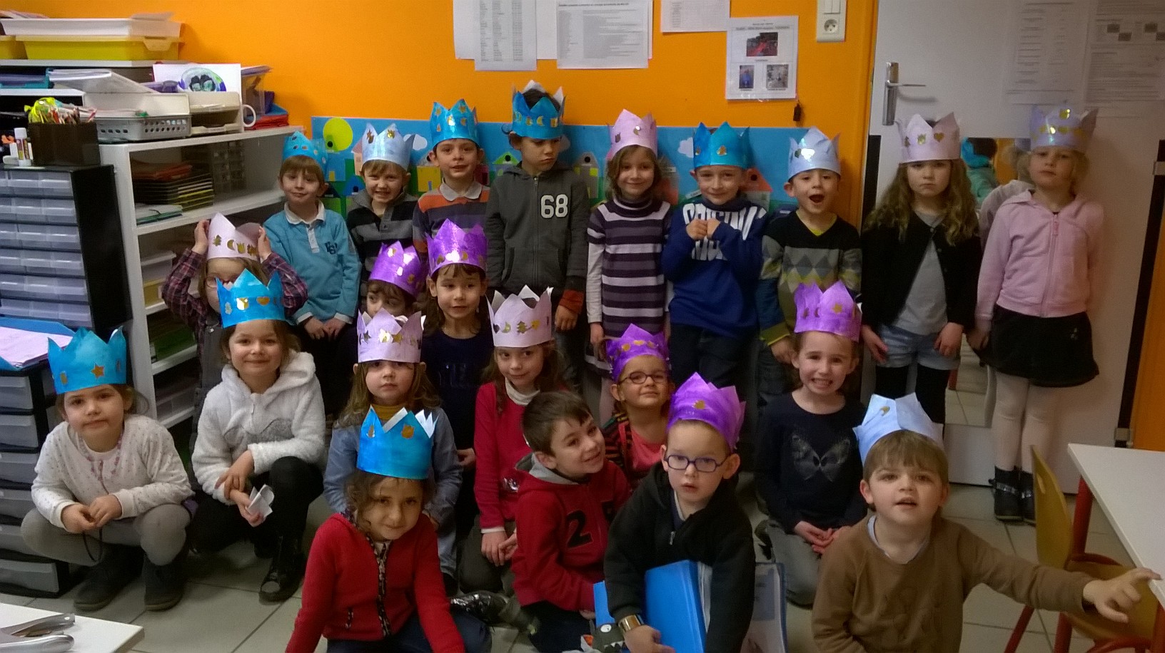 Les MS et GS après avoir dégusté la galette, dès le 8 janvier, ont réalisé des couronnes et ont posé pour la photo souvenir!